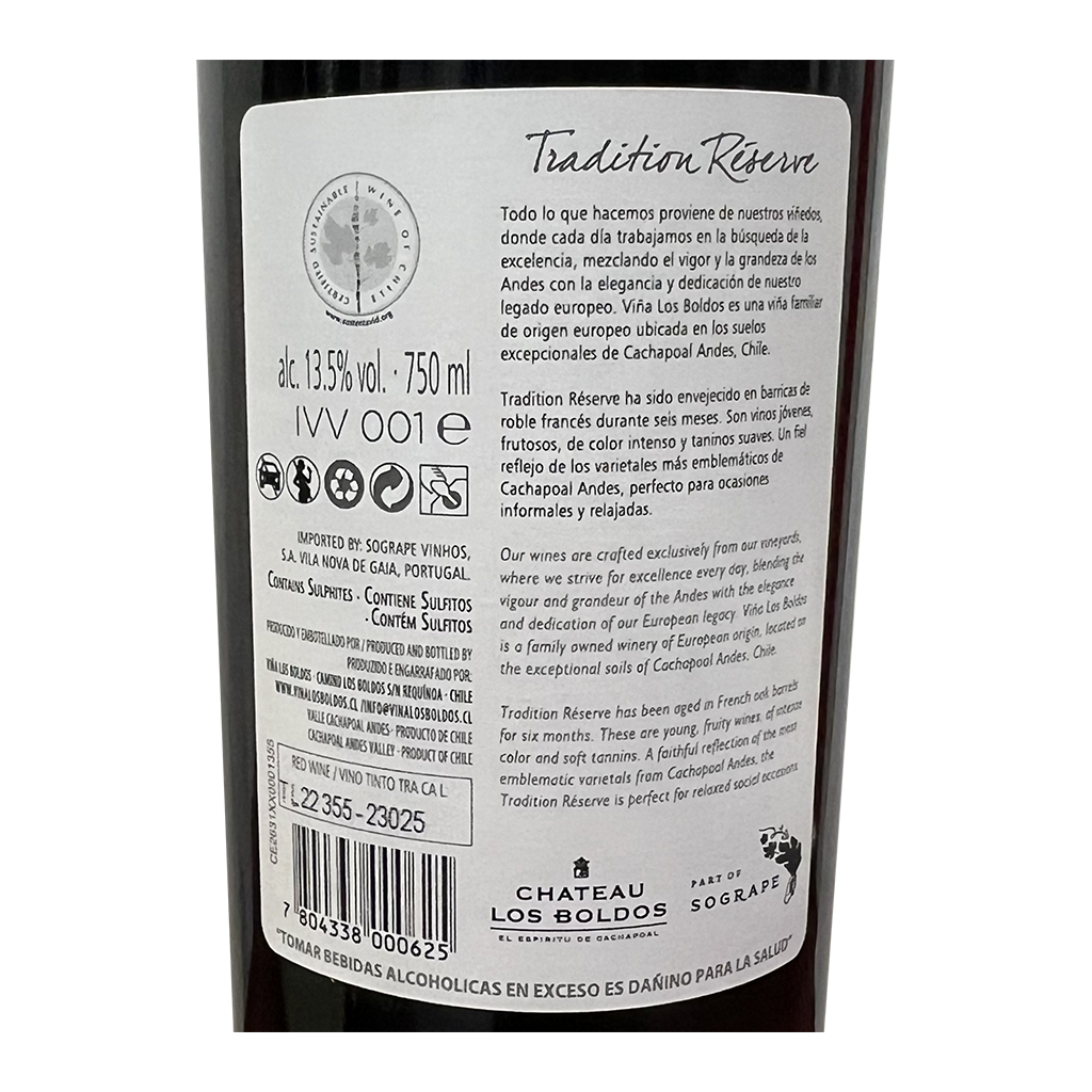 O Chateau Los Boldos Tradition Carmenere é um vinho tinto de distinção, produzido na região de Cachapoal, um verdadeiro testemunho da qualidade e tradição da vinificação.
