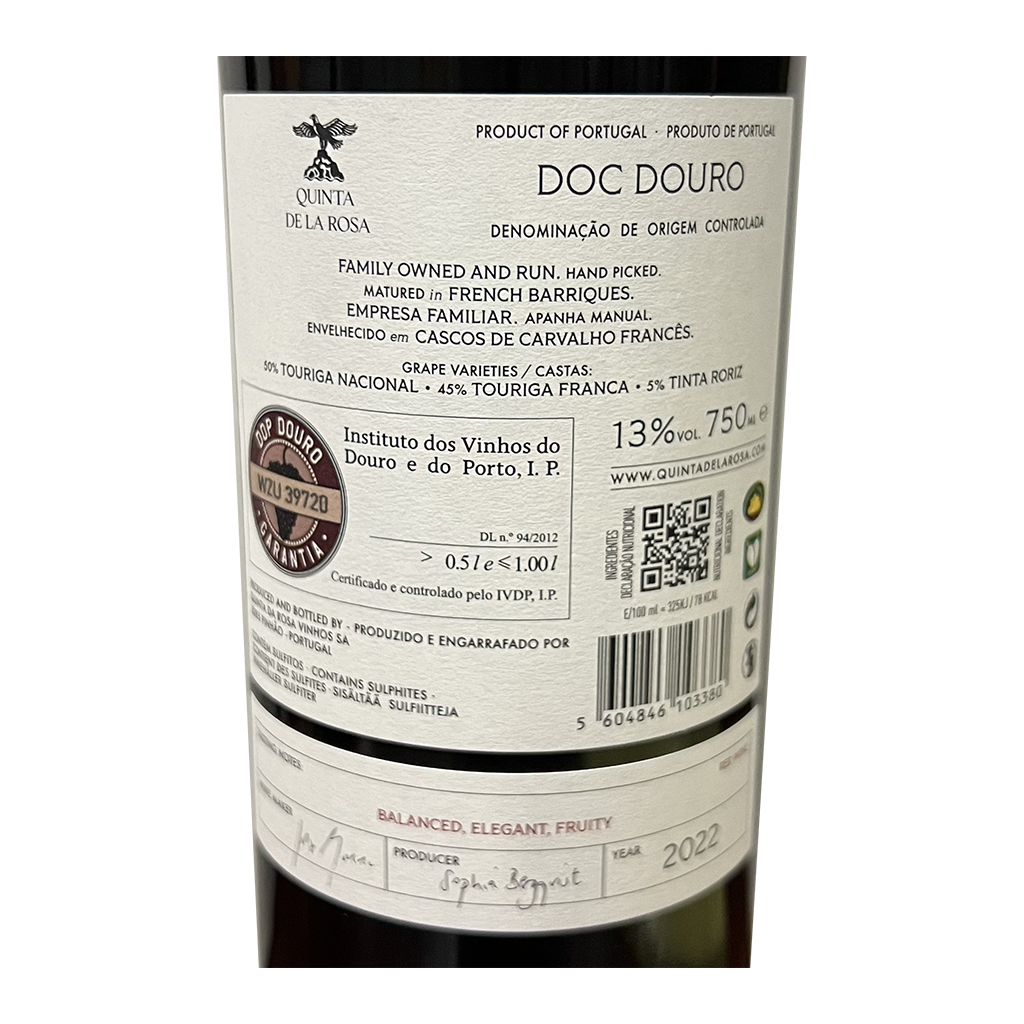 O Quinta de La Rosa tinto é um blend harmonioso de castas tradicionais do Porto, principalmente Touriga Nacional e Touriga Franca, com uma pequena percentagem de Tinta Roriz, Sousão e vinhas velhas. Este vinho tinto do Douro procura permitir que as uvas se expressem na garrafa, mantendo um equilíbrio entre extracção, tanino e carvalho. O produto resultante é um vinho rico e encorpado que ainda mantém frescura e vivacidade, graças a uma boa acidez e mineralidade.